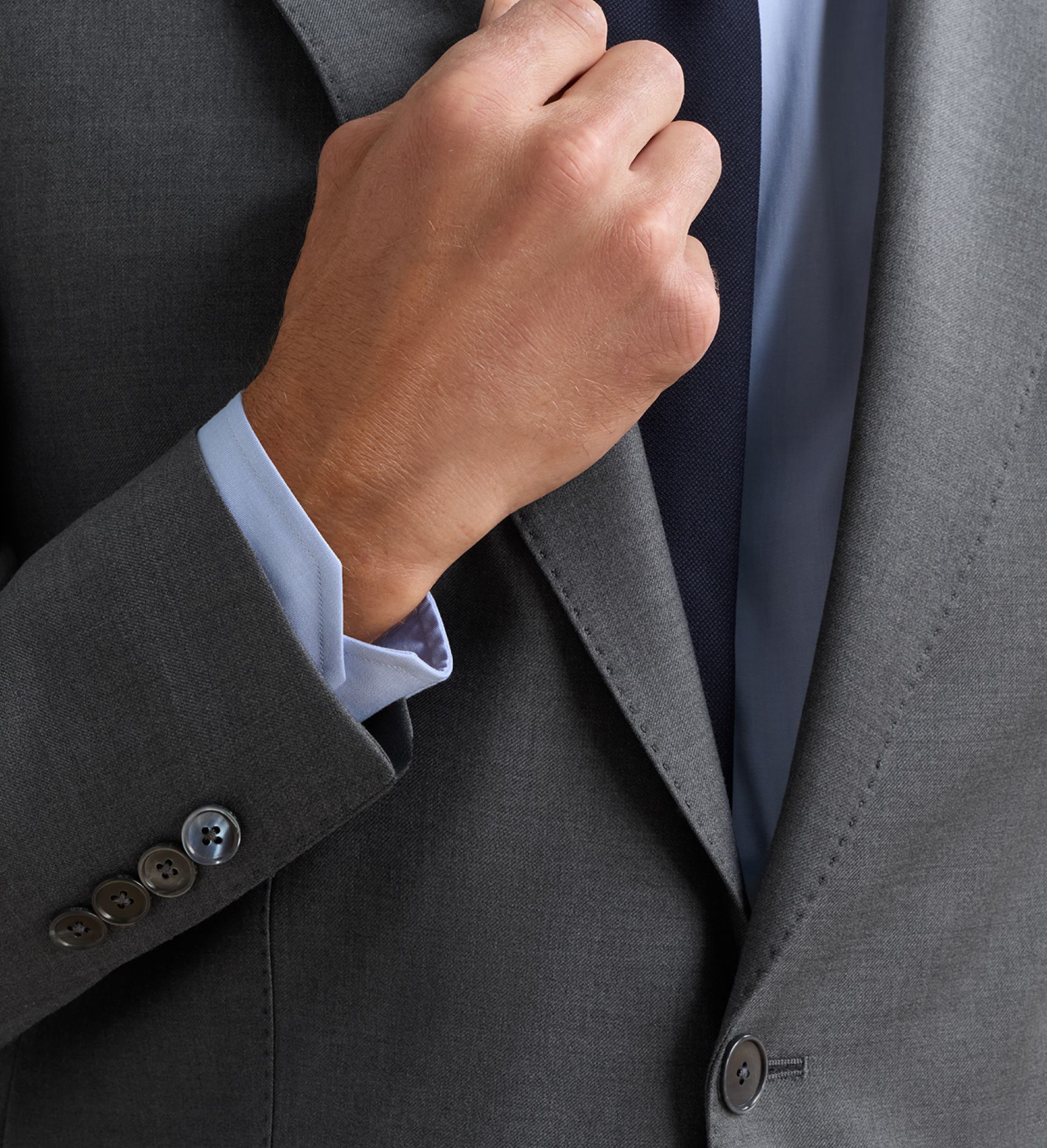 - Jacket shoulder seams should fall naturally just on the shoulders’ edge. Sleeves should finish at the wrist bone, allowing for shirt cuff to peek through. Tailor if needed.