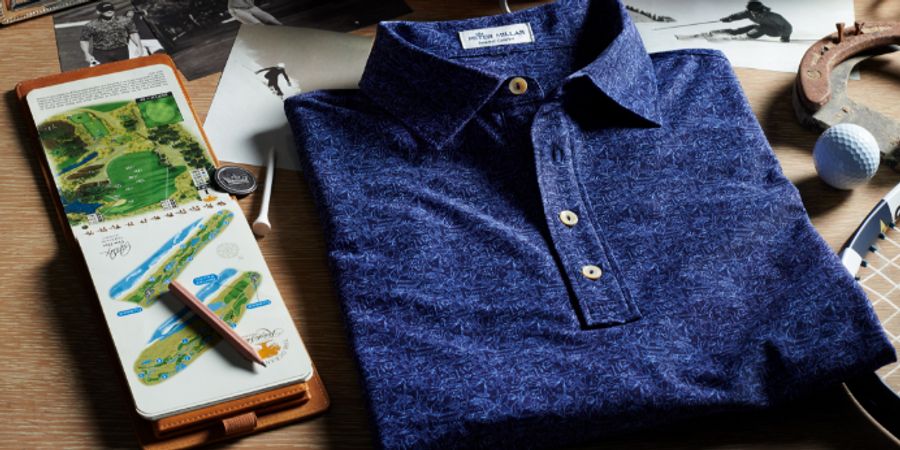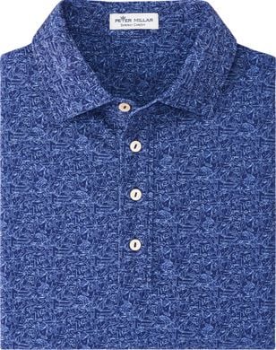performance polo from the ground up. The custom white print on a deep blue ground incorporates many of his